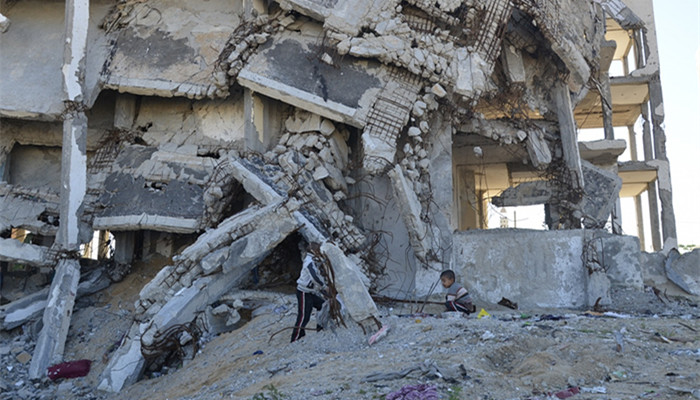 在一条脏乱的路上,废弃的建筑里尽是些混凝土板和挂着的金属丝,它们的旁边是唯一一栋在2014年以色列和哈马斯(即“伊斯兰抵抗运动”,成立于1987年的一个巴勒斯坦伊斯兰教逊尼派组织)交战中幸存的房屋。这一栋破旧、被人忽视的社会住房高高地矗立在加沙地带的最北端。