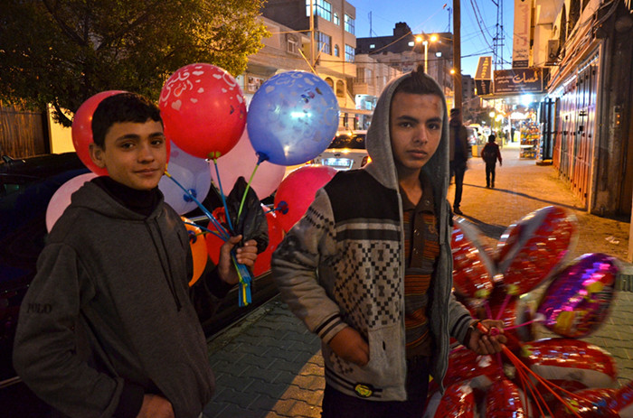 整个加沙地带都有儿童和青少年在工作,他们或在废墟中拾捡瓦砾,或在工厂、车库中工作,或在街头努力叫卖。Jamil Momen今年21岁,和他15岁的弟弟Haisam一起住在Shati的难民营。Jamil说想上大学,但他却不得不靠卖气球和一辆给孩子玩的小型电车来赚钱支撑他的家庭。Haisam也已经辍学以帮补家庭;他每天在公园、购物中心或一些位于加沙地带中心的餐馆外卖气球,气球15便士一个,Haisam一天大概赚4英镑,而Mazaj餐馆里一碟意面的价格都比他一天的收入高。