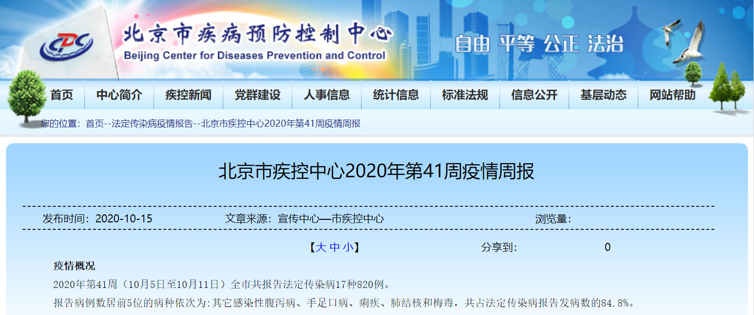 北京市疾控中心网站消息,2020年第41周(10月5日至10月11日)北京市共报告法定传染病17种820例。