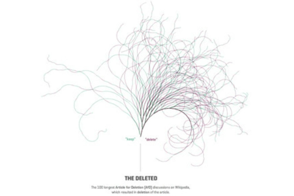 根据这个作品作者的调查,现在很多文章已经被从维基百科删除了。这个简单的图案展示的是现在存在的文章和那些已经被删除的冰山下的文章之间的差距。