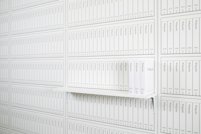 Michael Mandiberg抓住了人们喜欢有形的事物的特点,在2015年他尝试了印刷一部分维基百科。通过露露出版公司,他把网页版的维基百科转换成了可以打印的电子书版本,结果用7471个矩形装饰了他的艺术空间,代表那些可以被打印出来的全部的维基百科。