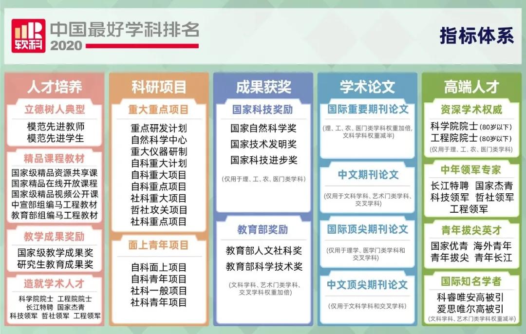 软科中国最好学科排名从人才培养、科研项目、成果获奖、学术论文、高端人才五个指标类别,共计50余项来反映学科的竞争实力。