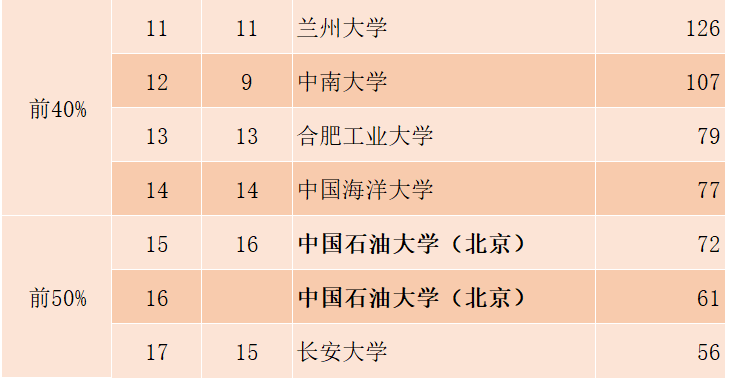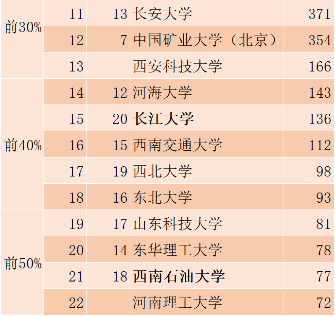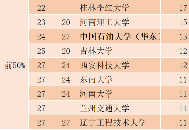 除此以外,西南石油大学、东北石油大学、长江大学、西安石油大学、华东理工大学、中国地质大学(北京)入围榜单前50%。