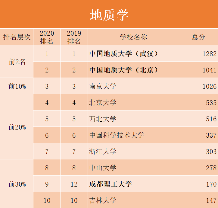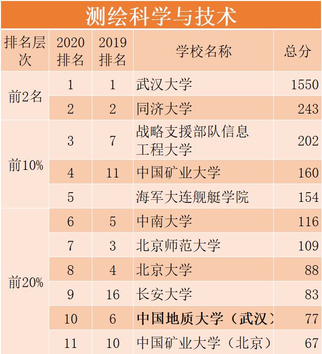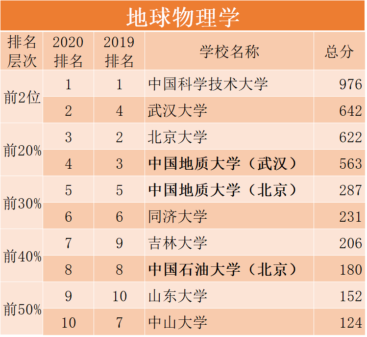 在这一学科排名中,有10所高校入围,中国科学技术大学、武汉大学位列前2名,北京大学、中国地质大学紧随其后。