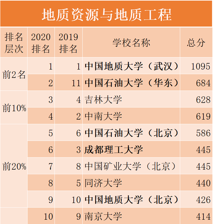 这一学科排名共有22所大学入围前50%,中国地质大学(武汉)以1095的高分位居榜首;中国石油大学(华东)则从2019年的第11位一跃摘得今年的第二桂冠。