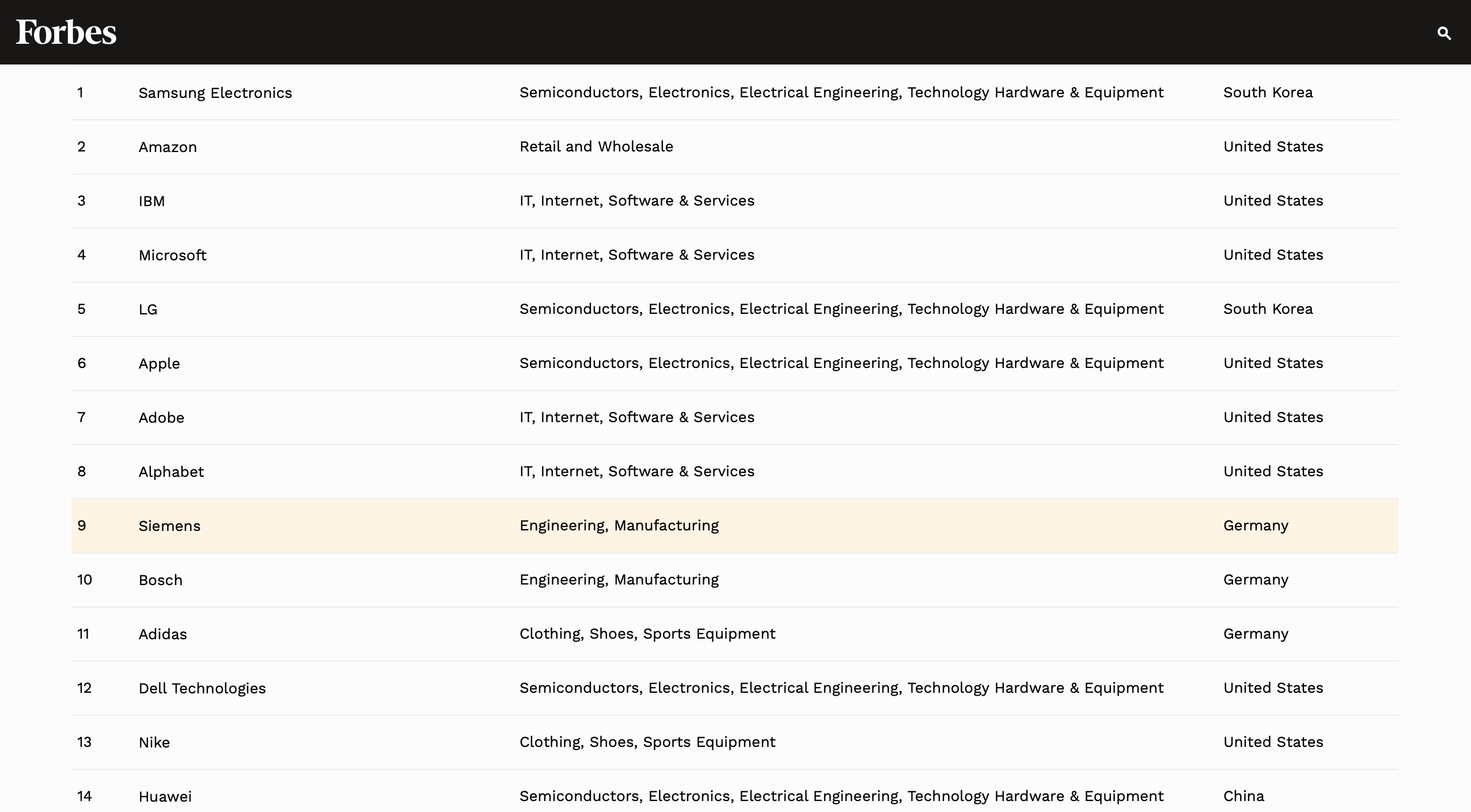 《福布斯》15日发布2020年全球最佳雇主榜单,三星电子、亚马逊、IBM、微软、LG排名前五位,第6至10位为苹果、Adobe、Alphabet、西门子、博世。华为排名第14位,阿里巴巴排名第50位,京东、奇虎360、腾讯的排名分别为158、171、247。