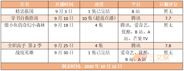 整个九月仅五部动画新作播出,其中两部动画为仅一集的短篇动画,一部动画为单集时长不足五分钟的泡面番,单集时长在15分钟以上的长篇动画仅腾讯独家播出的《穿书自救指南》和《全职高手 第2季》两部作品,其中《穿书自救指南》已经开了超前点播,是目前少数开启超前点播的动画作品之一。