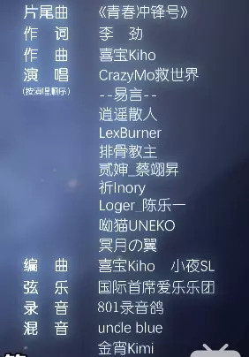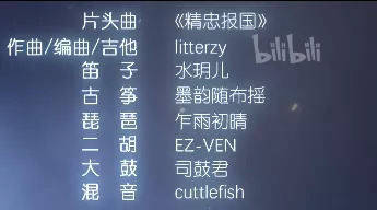 作为一部仅一集的短篇动画,《精忠报国》有两首音乐,并且班底阵容强大,包括了大量音乐区知名UP主和少量其他区UP主。其中有因古筝曲一战成名的“教主”墨韵随步摇,粉丝已经超过900万的B站动画/游戏区UP主LexBurner,400万粉丝的游戏区知名UP主逍遥散人等等,虽然不一定有职业水准,但能以自身的粉丝基础为动画作品引流。