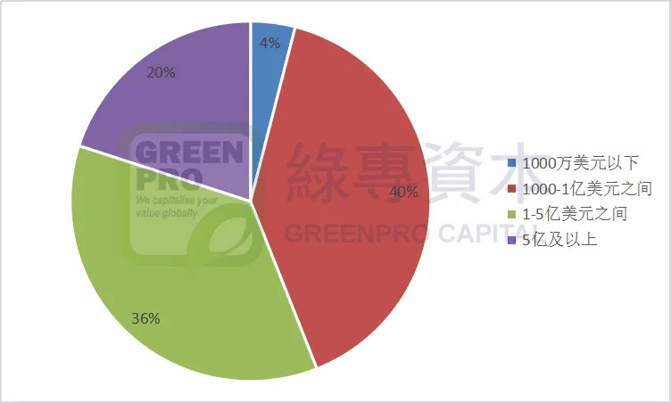 其中,1000万美元以下,有1家;1000-1亿美元之间,有10家;1-5亿美元之间,有9家;5亿以上,有5家。