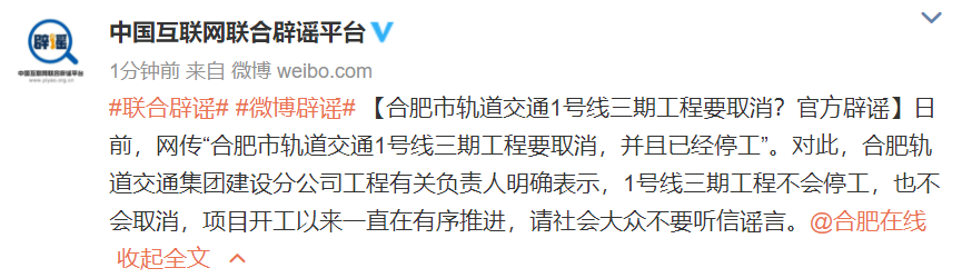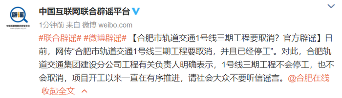中国互联网联合辟谣平台微博消息,日前,网传“合肥市轨道交通1号线三期工程要取消,并且已经停工”。对此,合肥轨道交通集团建设分公司工程有关负责人明确表示,1号线三期工程不会停工,也不会取消,项目开工以来一直在有序推进,请社会大众不要听信谣言。