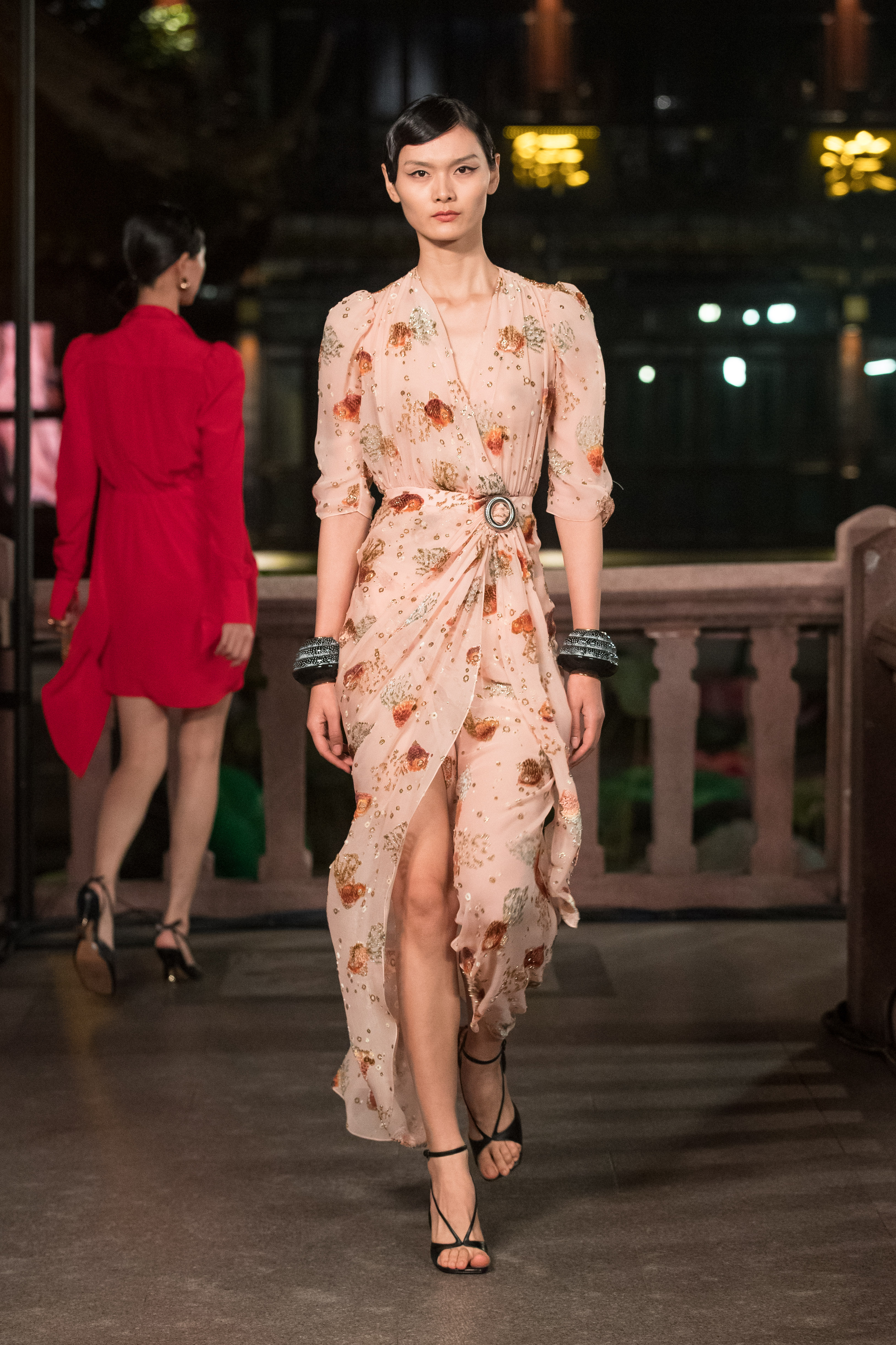 了解Jeane Lanvin女士生平的人都知道,这位品牌创始人热爱游历,曾经从多国搜集了面料汇编成册,其中不乏来自中国的元素。Bruno Sialelli在这一季大胆地融入了中国古典绘画美学,在服装的设计和剪裁上考虑了中式的流线型轮廓,并加入了中国风格强烈的印花图案和金鱼等装饰元素,同时采用了绸缎等中国特有的面料。