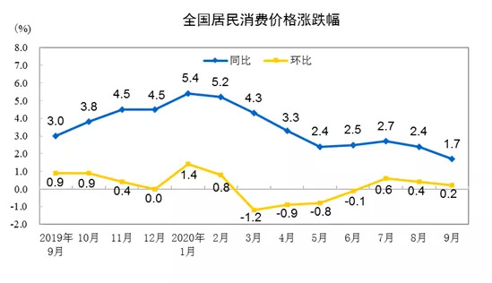 国家统计局在10月15日公布的数据显示,9月份CPI同比上涨1.7%,较8月份下跌0.7个百分点。这也是自7月份以来,CPI连续两个月回落。
