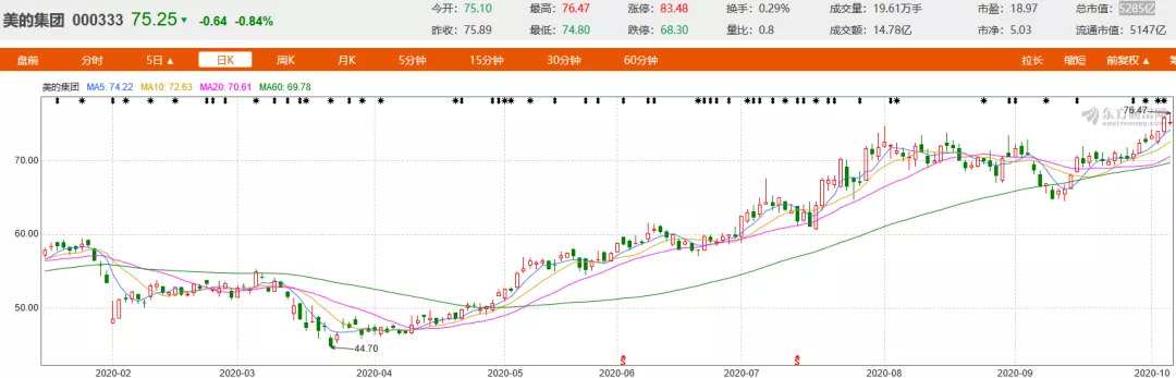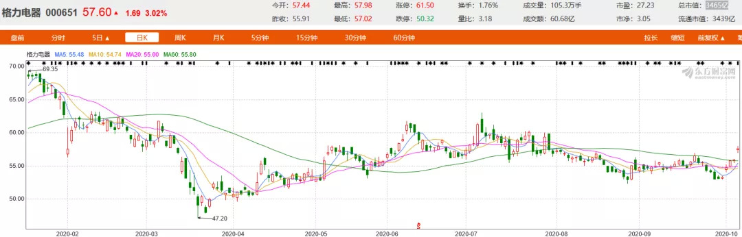 事实上,在今年7月初,大盘走出一轮牛市行情时,格力电器却是反向节节下跌,从7月7日最高的63元,跌至9月底的53元。