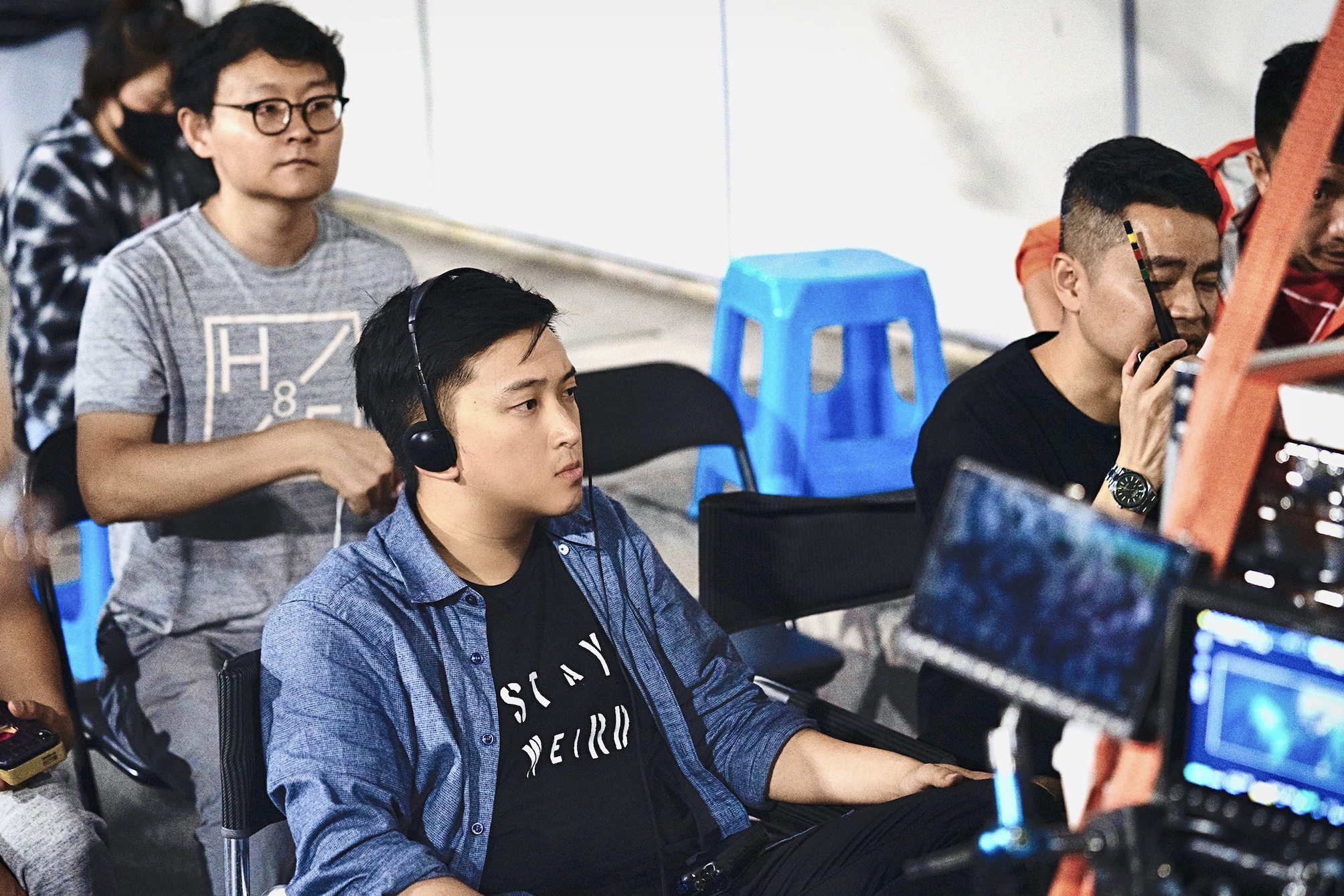 刘国庆跟了整个拍摄过程,他坐在导演陈奕甫的身后,每一条都要看画面、听声音。“奕甫在现场需要掌控和关注的东西太多了,很多时候都是多机位拍摄,所以在他面前的是好几个显示器,他需要关注演员的表演、镜头的运动、声音是否清晰等等情况。我首先会特别关注演员台词和表演上一些细节的东西,看到一些问题会及时跟踪反馈。”