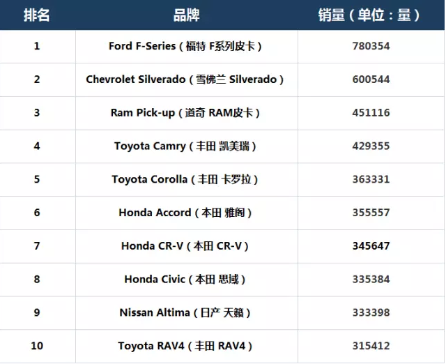 一直以来,福特F系列皮卡都是整个北美地区最受欢迎的车型,此次以780354辆的成绩稳拿销量第一的宝座,更加证明了它的实力。换装3.5T发动机、经过重新设计的车身,让它在经济和实用方面找到了完美的平衡;足够强的动力、通过性和载物能力,让它成为最强的多功能车,所以说第一名的位置绝对是实至名归。