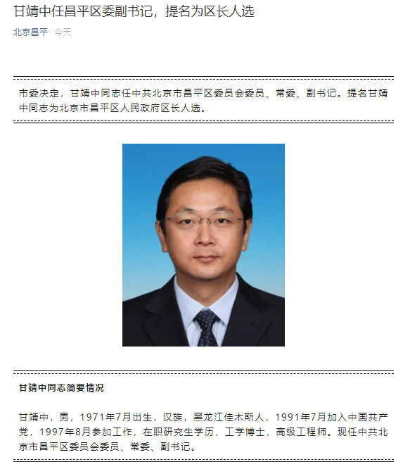 据北京昌平微信公众号10月16日消息,北京市委决定,甘靖中同志任中共北京市昌平区委员会委员、常委、副书记。提名甘靖中同志为北京市昌平区人民政府区长人选。
