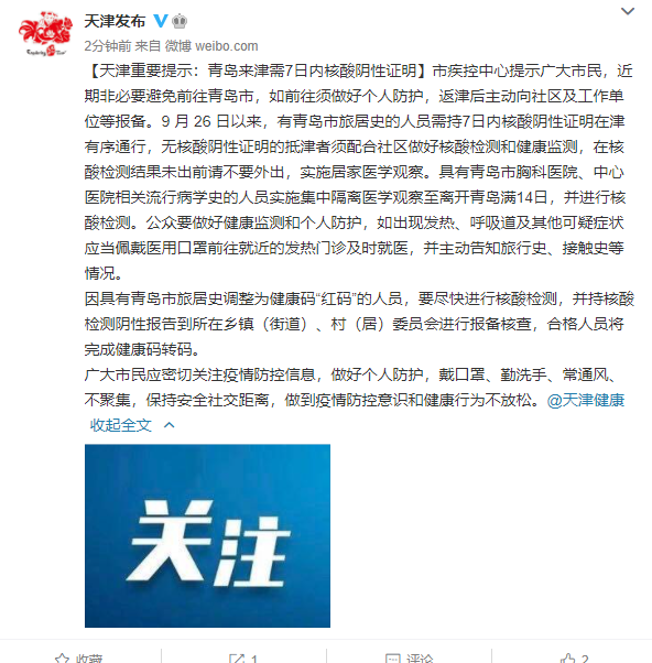 据天津市人民政府新闻办公室官方微博10月16日消息,天津市疾控中心提示广大市民,近期非必要避免前往青岛市,如前往须做好个人防护,返津后主动向社区及工作单位等报备。9月26日以来,有青岛市旅居史的人员需持7日内核酸阴性证明在津有序通行,无核酸阴性证明的抵津者须配合社区做好核酸检测和健康监测,在核酸检测结果未出前请不要外出,实施居家医学观察。具有青岛市胸科医院、中心医院相关流行病学史的人员实施集中隔离医学观察至离开青岛满14日,并进行核酸检测。公众要做好健康监测和个人防护,如出现发热、呼吸道及其他可疑症状应当佩戴医用口罩前往就近的发热门诊及时就医,并主动告知旅行史、接触史等情况。