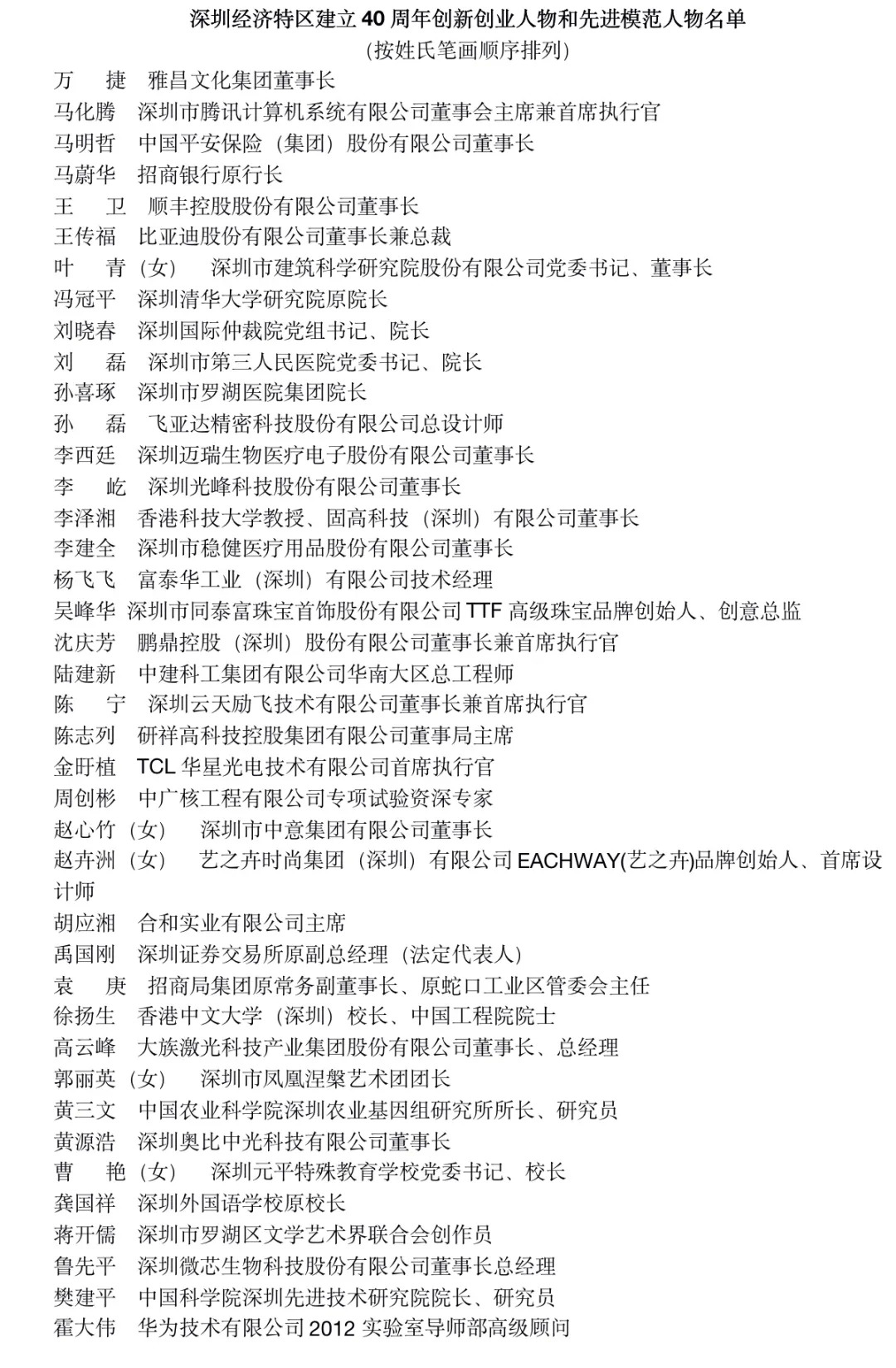 近日,在深圳经济特区建立40周年之际,深圳市委和市政府发布关于表彰深圳经济特区建立40周年创新创业人物和先进模范人物的决定。腾讯公司马化腾、中国平安马明哲、招商银行原行长马蔚华等上榜,华为任正非、万科王石缺席。