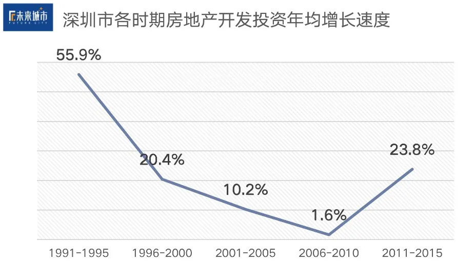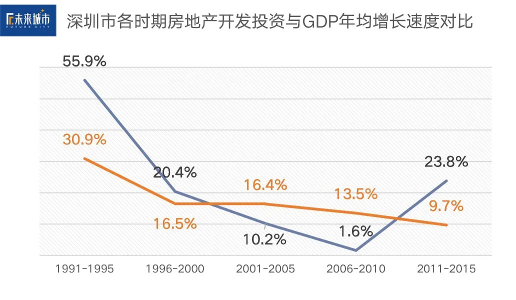 对比深圳市GDP增速,可以看出二者前期走势大致相同,在房地产的驱动下经济稳步发展,但近些年规律不再,房地产投资的飙升并没有拉起逐渐放缓的经济增速。