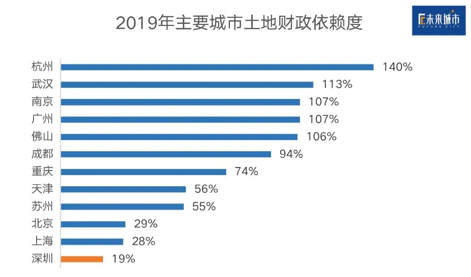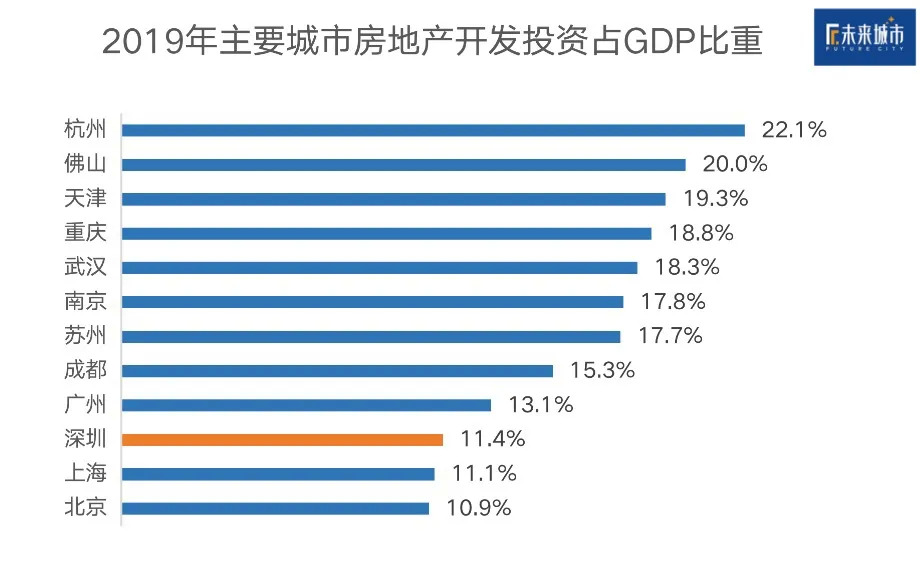但深圳近日的举动似乎没有因此畏手畏脚,原因在于深圳的房地产依存度并不高,2019年深圳房地产开发占GDP比重为11.4%,土地收入金占财政收入仅为19%。