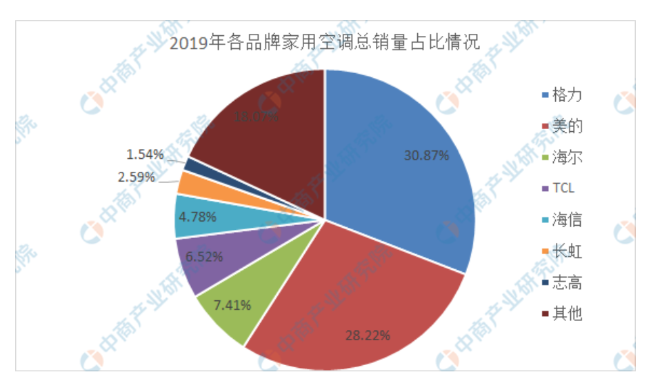 2019年市场份额方面,据中商产业研究院数据显示,2019年各品牌家用空调总销量占比中,第一梯队:格力占比30.87%、美的占比28.22%、海尔占比7.41%;第二梯队:TCL占比6.52%、海信占比4.78%、长虹占比2.59%及志高占比1.54%。
