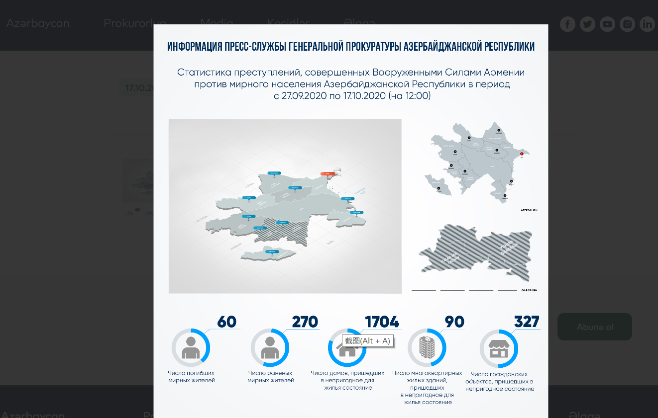 阿塞拜疆总检察长办公室官网信息图显示:“60名阿塞拜疆平民丧生,270人受伤;1704间房屋、90座多单元住宅楼被毁,327个民用设施受损。”