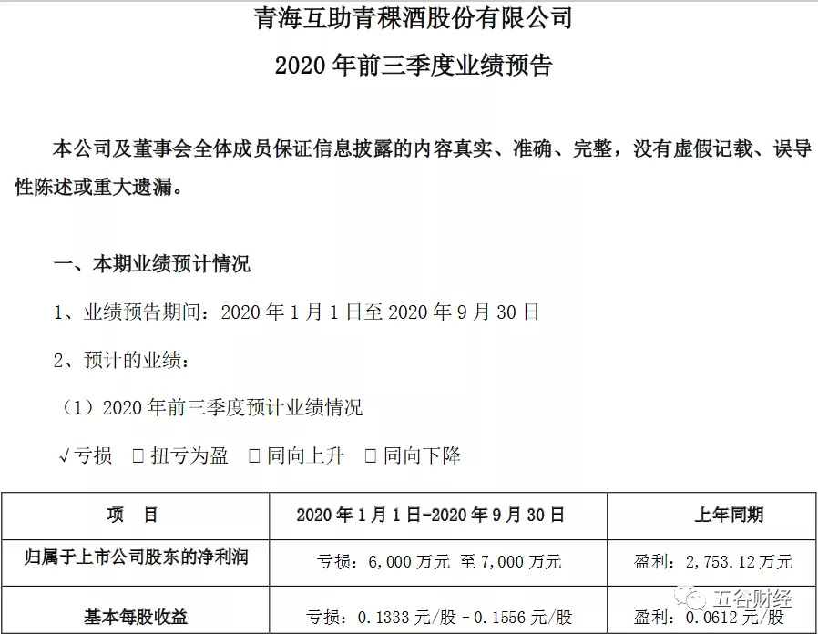 10月15日,青青稞酒公开了2020年前三季度业绩预告,归属于上市公司股东的净利润仍为负数,在-6000万元和-7000万元之间,而2019年同期则为正数,约为2753万元。