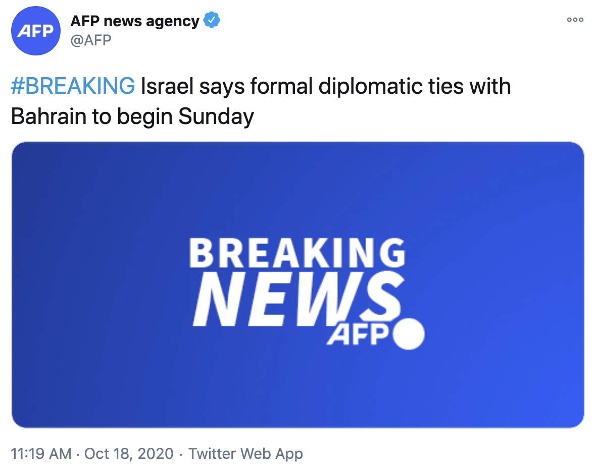 法新社10月18日消息,以色列称与巴林的正式外交关系将于周日开始。以色列与阿联酋和巴林上月在白宫签署了关系正常化协议。