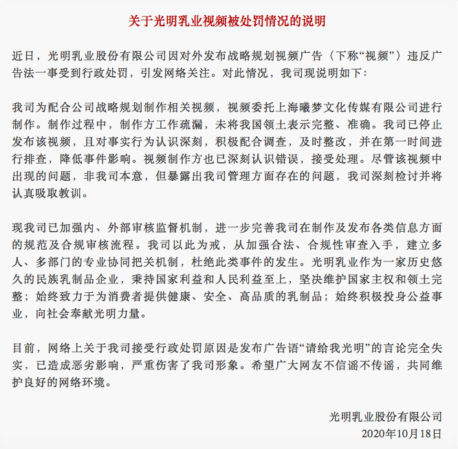 10月18日,光明乳业就视频广告违反广告法并受到行政处罚一事发布说明:视频制作方工作疏漏,未将我国领土表示完整、准确,公司已停止发布该视频,且对事实行为认识深刻,积极配合调查,及时整改,并在第一时间进行排查,降低事件影响。网络上关于公司接受行政处罚原因是发布广告语“请给我光明”的言论完全失实。