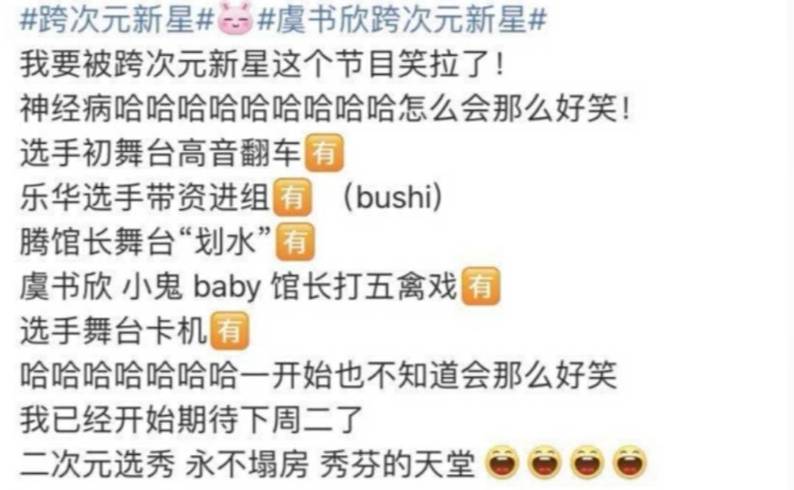虽说多数选秀综艺在海选阶段都自带喜剧效果,但像《跨次元新星》这样,硬糖君看完还会想起来就傻笑,且迫不及待传播给亲朋好友共乐乐的,还是过于骨骼清奇。
