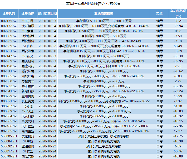 此外,本周还有至少28家公司披露亏损三季报。其中,泰禾集团(000732.SZ)预亏16.50亿元-22.30亿元,天齐锂业(002466.SZ)预亏9.54亿元-15.90亿元,*ST新光(002147.SZ)预亏9.80亿元-10.30亿元。