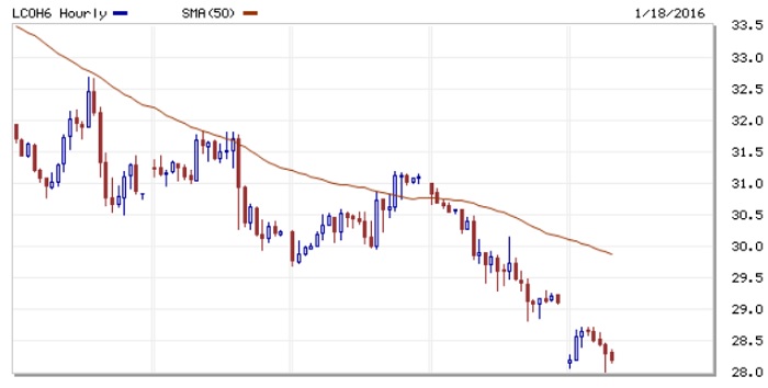 亚洲交易时段后市,全球基准ICE布伦特原油期货价格一度跌至每桶27.67美元,创2003年11月以来最低水平。截至北京时间14:33(伦敦当地时间上午6:33),布伦特油价跌2.04%,至每桶28.37美元。