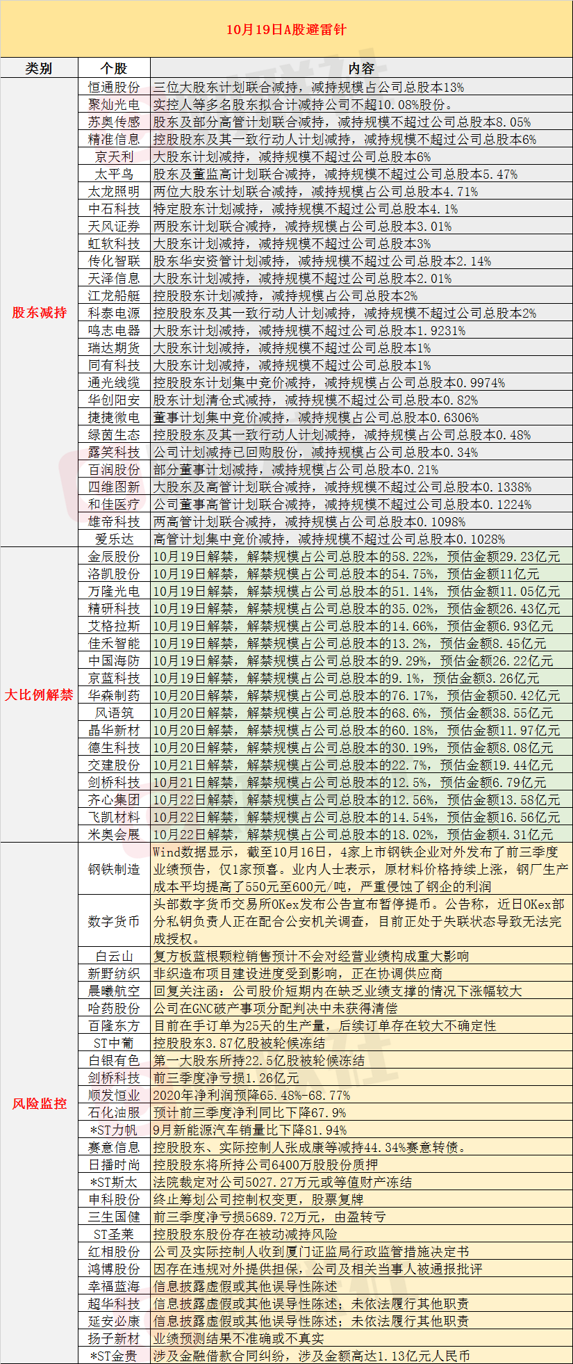 近日A股拟减持规模急剧增加,恒通股份、聚灿光电、苏奥传感、精准信息、京天利、太平鸟等个股减持规模均在5%及以上,其中恒通股份、聚灿光电、苏奥传感减持规模均高达8%以上;金辰股份、洛凯股份、万隆光电、华森制药、风语筑、晶华新材等个股将迎来50%以上的大比例解禁;数据显示,截至10月16日,4家上市钢铁企业对外发布了前三季度业绩预告,仅1家预喜。头部数字货币交易所OKex于近期发布公告宣布暂停提币。白云山复方板蓝根颗粒销售预计不会对经营业绩构成重大影响。顺发恒业、石化油服预计前三季度净利润均降6成以上。晨曦航空回复关注函:公司股价短期内在缺乏业绩支撑的情况下涨幅较大。