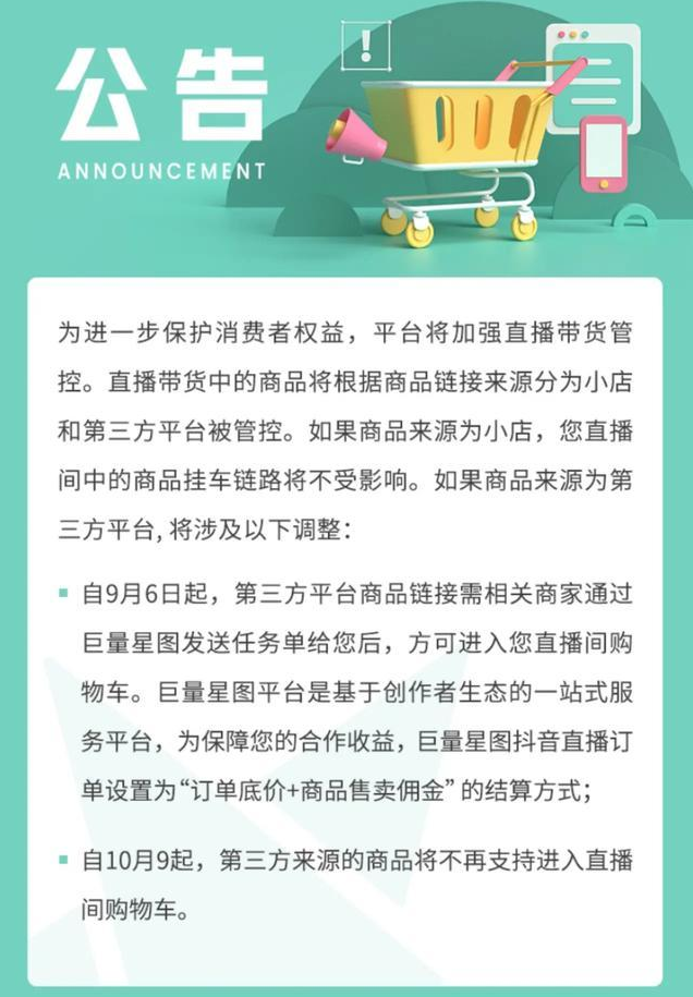 8月26日,上述新规生效仅一周,抖音再次宣布,将于10月9日切断直播间的第三方平台外链,只能售卖来自抖音小店的产品。