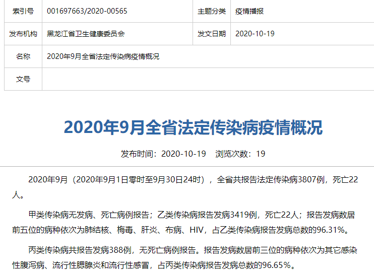 黑龙江卫健委网站10月19日通报,2020年9月(2020年9月1日零时至9月30日24时),黑龙江省共报告法定传染病3807例,死亡22人。
