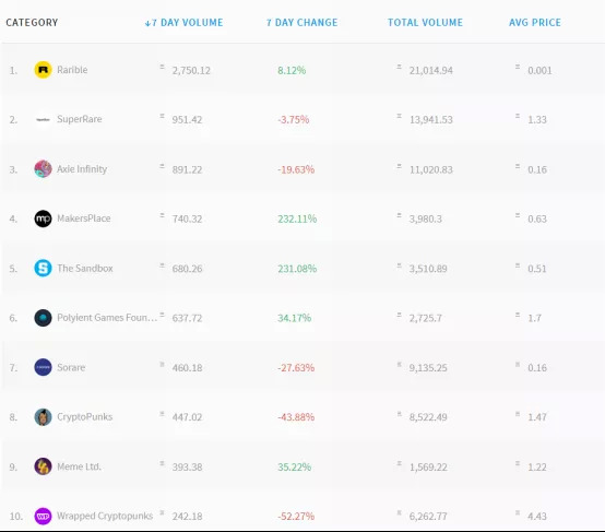 在MEME的牵头下,市场出现三种不同类型的NFT+DeFi项目;比如在去中心化金融项目中引入NFT概念的MEME、DEGO,抵押NFT进行DeFi挖矿的WHALR、CARGO,以及直接在NFT平台引入流动性挖矿的Rarible。其中MEME、WHALR、DEGO等项目的代币上线之初价格皆出现翻倍增长;而Rarible启动流动性挖矿后,不到两个月时间交易量就赶超老牌交易所OpenSea,成为当前最大的NFT数位收藏品交易平台,近7日交易量达2750 ETH,在该领域位列第一。