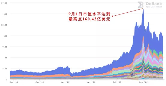 经过三个月的连番暴涨,DeFi领域市场总值在2020年9月1日达到顶峰,数值达160.42亿美元,累计涨幅约为446%,与年初相比增长超1042个百分点,成为今年区块链行业最为火热的加密板块。不过很快的,在Sushiswap创始人被爆套现、多个项目接连暴雷跑路的影响下,该领域的市场总值转而快速下跌,短短一周时间便回落至八月初的水平,当前相关项目的总市值约为99.2亿美元。