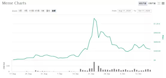步入九月DeFi市场遇冷,即便是该领域最大的去中心化交易所Uniswap发币也未能提振市场信心;反观MEME,热度不降反升,从9月14日开始连日直线飙涨,代币价格于9月22日提升至最高点1624美元,涨幅逾186%。