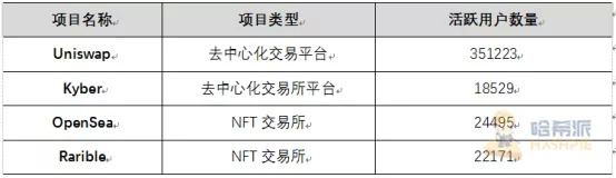 DeFi头部项目与NFT交易所的活跃用户数量(数据源自:dapp.com;截止时间:2020年10月9日)