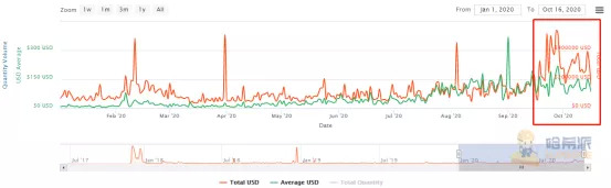 在DeFi降温期间,以MEME为首的NFT市场迅速崛起,日交易总量从9月17日开始不断攀升,并于27日达到年内最高点54万美元。与此同时,基于以太坊的艺术平台SuperRare和号称最大NFT交易市场的OpenSea,月成交量在当月双双创下历史新高,分别达77.7万以及275万美元。