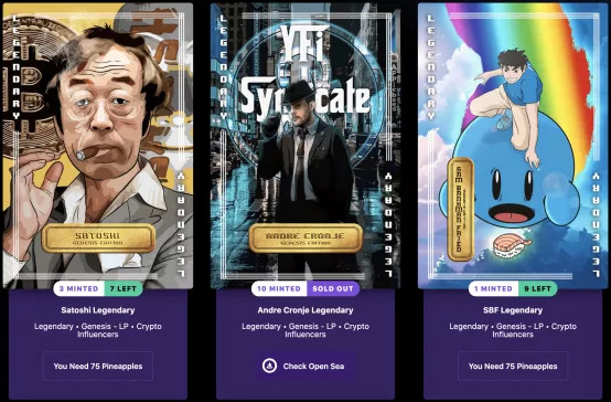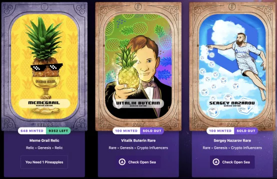 该项目参照了YFI的发行模式,用户在Uniswap的资金池内抵押空投或者是购买所得的MEME Coin即可挖取MEME的非流动代币「菠萝」,使用「菠萝」可兑换稀有程度不同的NFT数位卡牌,并能通过OpenSea交易平台发售或者买入其他卡牌。这种在沿用流动性挖矿基础上添加NFT的玩法,给予入场用户更多的投机机会,让MEME从一个毫无价值的空气币,摇身一变成为市值逼近千万美元的热门项目;与此同时,还掀起领域一阵NFT+DeFi的组合热潮。