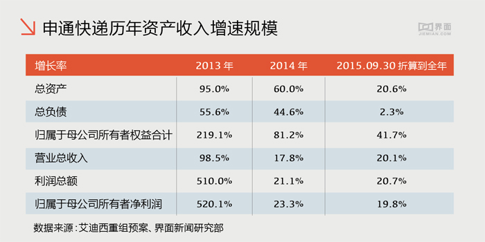 除了此前说到的快递行业增速下滑,从“三通”中申通速递的收入、利润增速规模中也可以验证这一事实。从艾迪西披露的重大资产重组预案中可以看到,申通的收入以及利润规模增速大幅放缓,特别是利润规模的增速自2014年以来快速下滑。除去利润的大幅萎缩,加盟的风险也日益严重。分公司拖欠工资造成快递堆积如山的新闻报道层出不穷。
