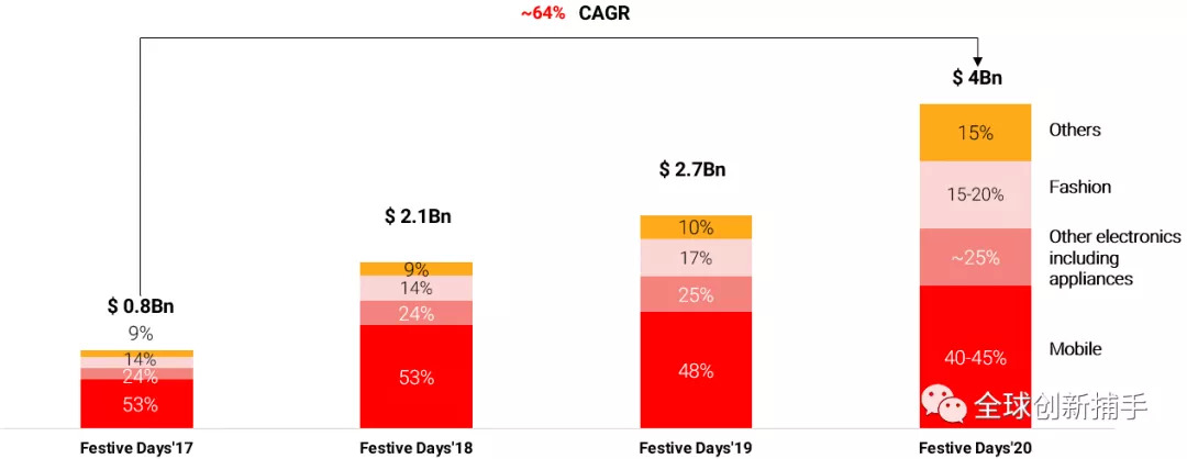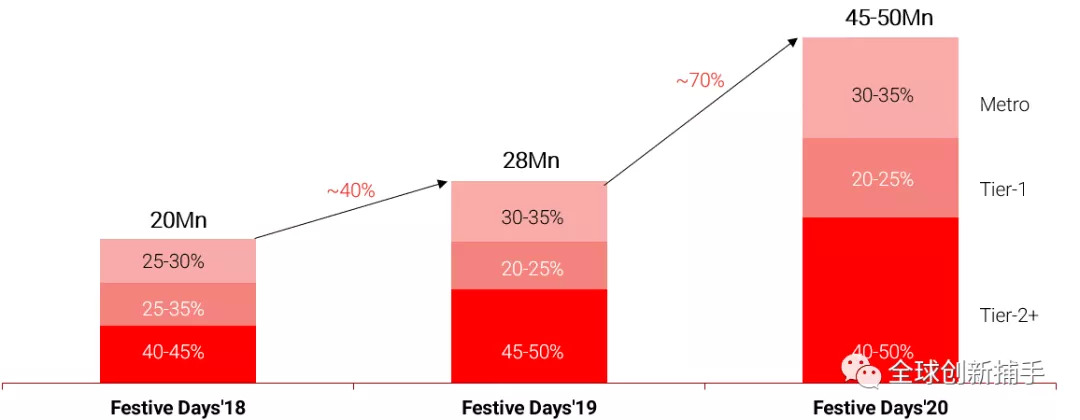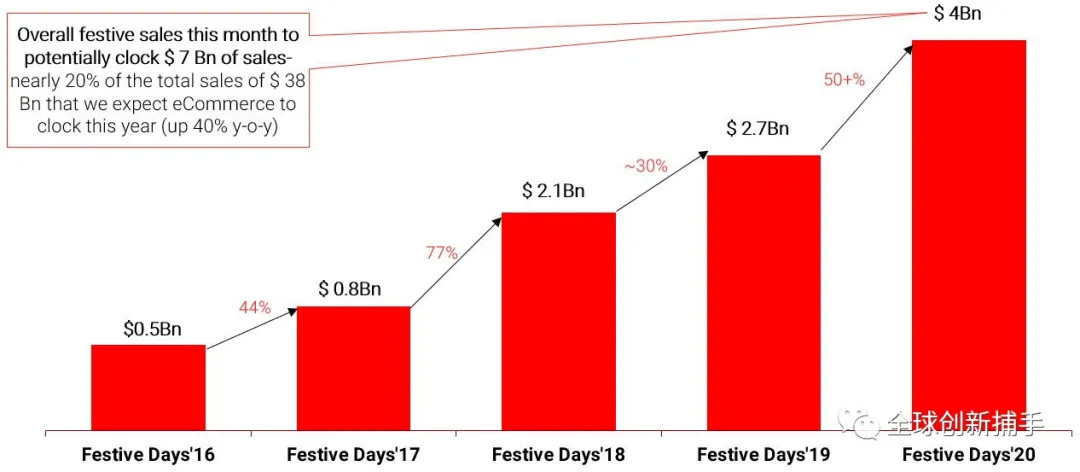 据RedSeer预计,今年印度市场节日活动销售额将同比去年增长近50%,达40亿美元规模。同时节日促销季当月销售额可能达到70亿美元,比去年的38亿美元增长84%。