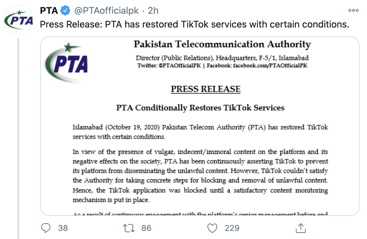 根据PTA周一发布的声明,TikTok已承诺将依据社会规范和巴基斯坦法律审核内容,确保连续上传非法内容的用户被屏蔽在平台之外,PTA由此解除TikTok的禁令。