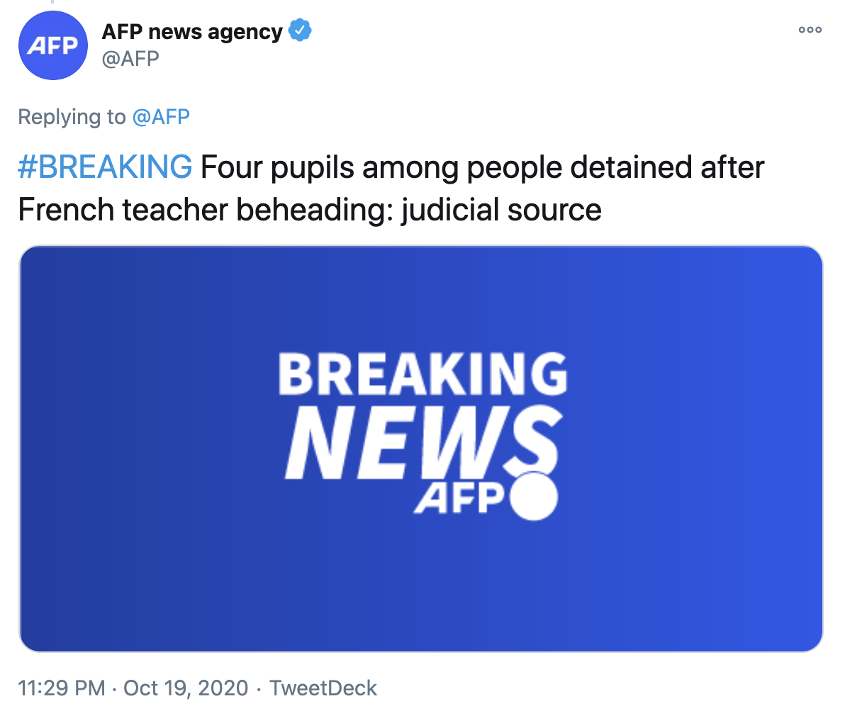 法新社10月19日消息,司法消息来源称,法国教师遭斩首案发生后被拘留的人之中有4名学生。