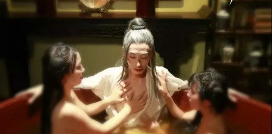 只见他饰演的东厂公公从马上跃起,空中一个完美的旋转,擒得两个人头,一声嘶吼,瞬间拔下头颅,血溅当场,画面血腥程度直逼《电锯惊魂》;而另一片段中,公公与两位裸体美女在浴盆里“戏水”,画面可谓活色生香;第三个片段却更有意思,两位美女围绕一门“大炮”上下其手,性暗示太过明显。