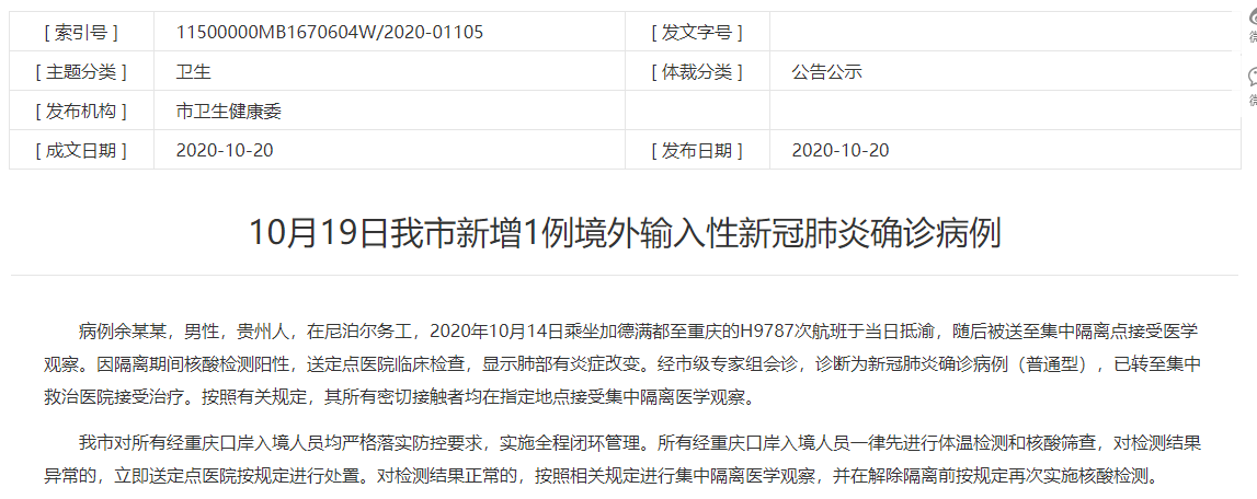 重庆卫健委10月20日通报:10月19日重庆市新增1例境外输入性新冠肺炎确诊病例。