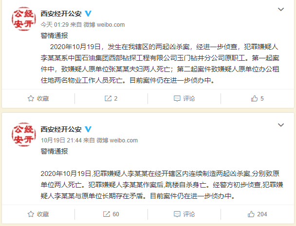 西安市公安局经开分局官方微博10月20日通报称,2020年10月19日,发生在辖区内的两起凶杀案,经进一步侦查,犯罪嫌疑人李某某系中国石油集团西部钻探工程有限公司玉门钻井分公司原职工。第一起案件中,致嫌疑人原单位张某某夫妇两人死亡;第二起案件致嫌疑人原单位办公租住地两名物业工作人员死亡。目前案件仍在进一步侦办中。