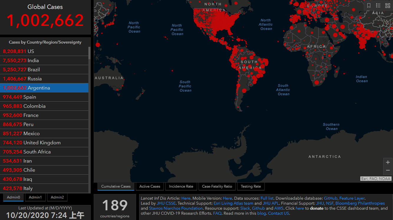 美国有线电视新闻网10月20日消息,据阿根廷政府报告称,周一(19日),阿根廷已知的新冠病毒病例总数已突破100万例。根据美国约翰斯·霍普金斯大学的数据,阿根廷是仅次于美国,印度,巴西和俄罗斯的第五个报告超过100万例冠状病毒病例的国家。