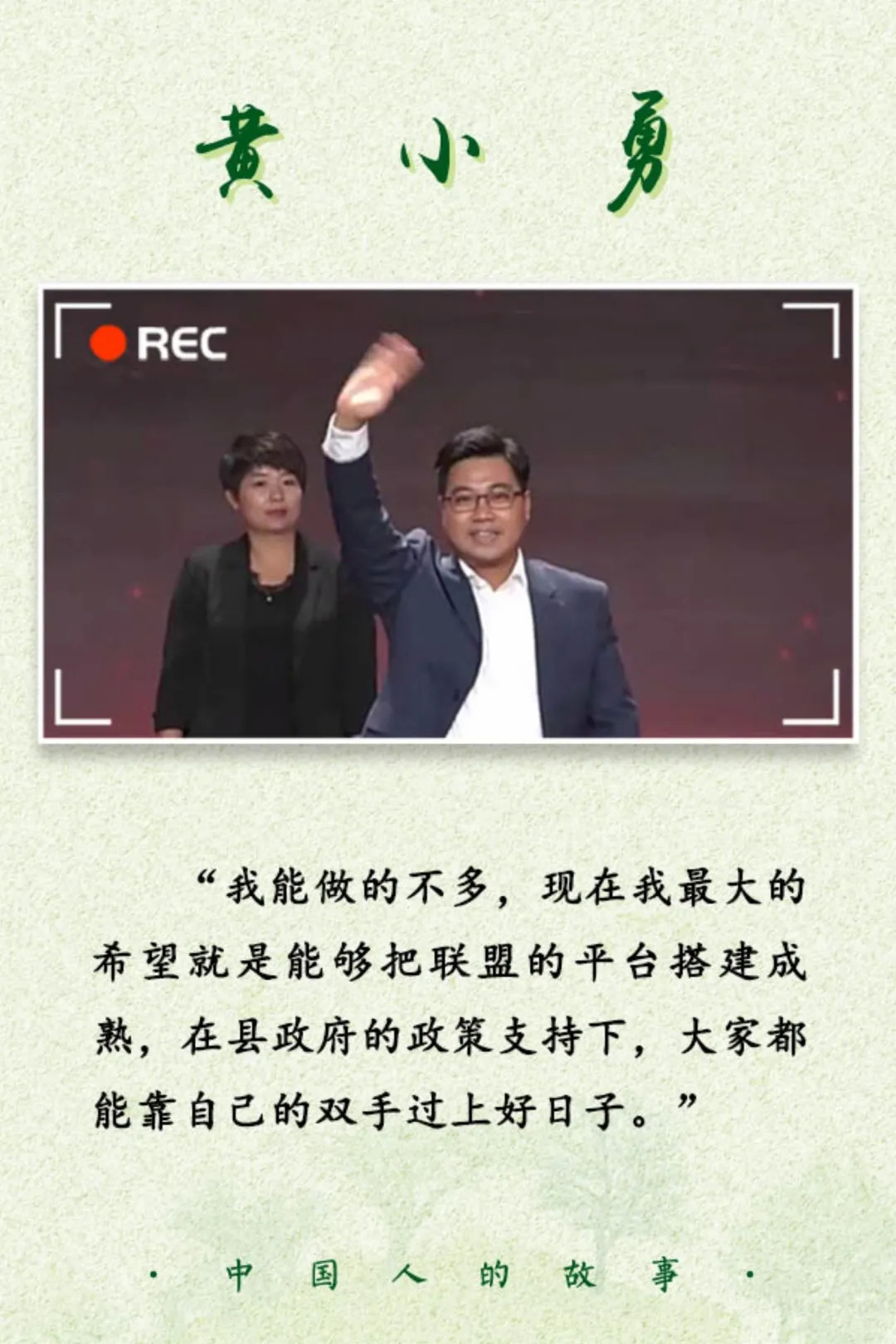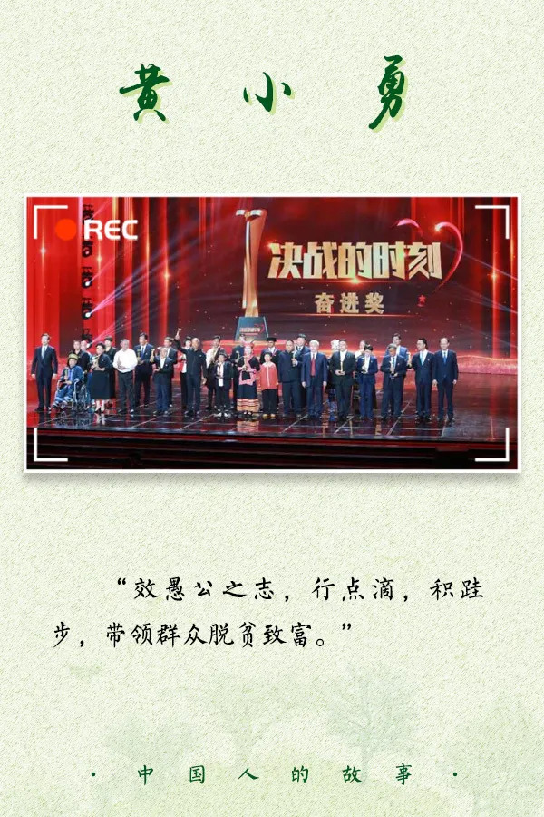 有人曾这样形容黄小勇:“效愚公之志,行点滴,积跬步,带领群众脱贫致富。”“他是江西赣州市石城县珠坑乡坳背村的80后新‘愚公’,麒麟山的‘山大王’,共同富裕的‘领头羊’。”复绿、护绿,改善生态环境、减少水土流失,脱贫致富……在贫穷与水土流失如影随形的村庄,他让荒山秃岭变成绿水青山,也让农民在家门口“淘金掘银”,走向富裕。